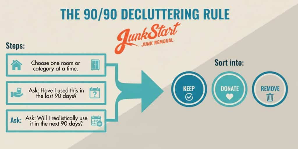 At JunkStart Junk Removal, we see firsthand how quickly garages, attics and spare rooms fill up in San Antonio homes. The 90/90 decluttering rule gives homeowners a clear starting point.